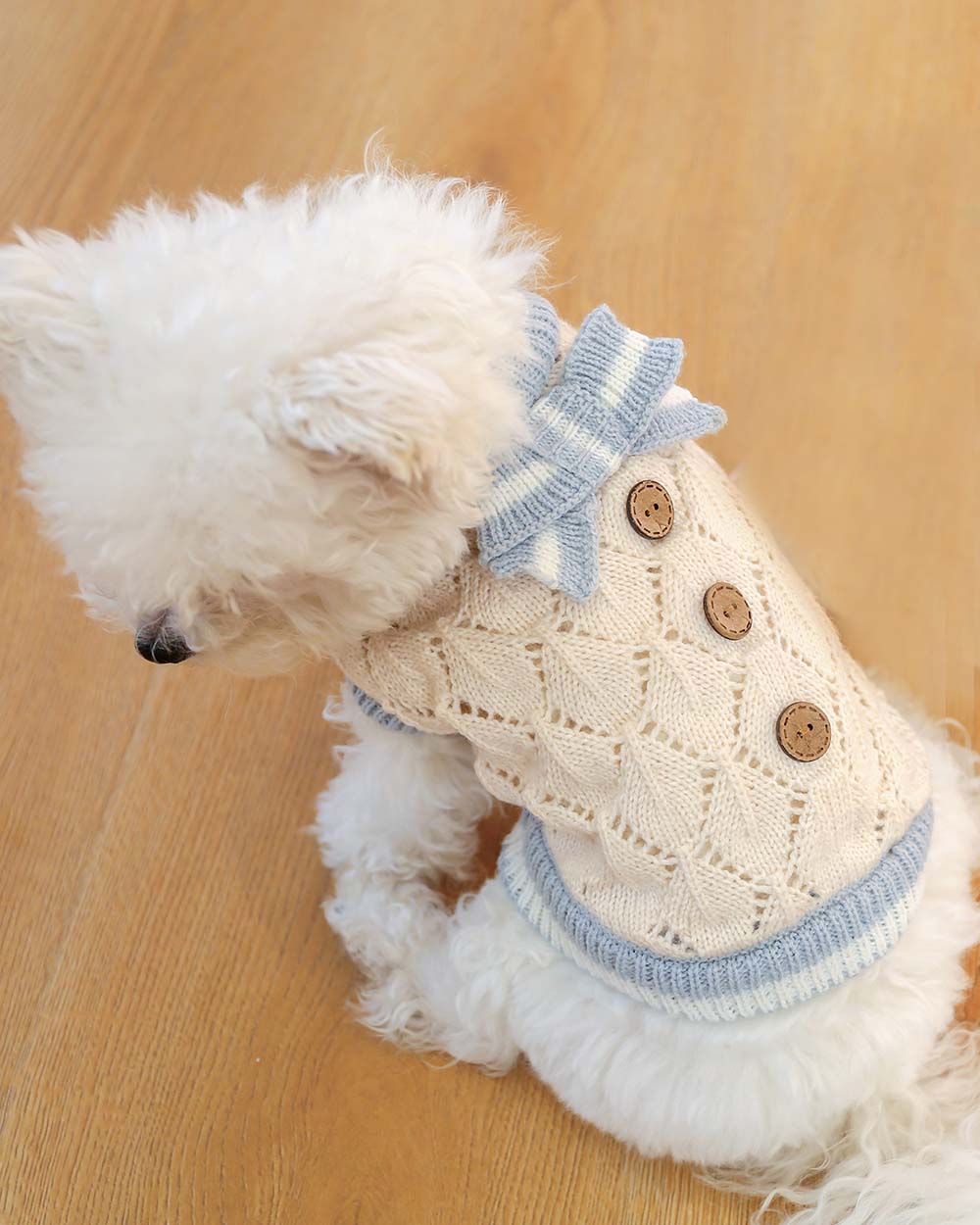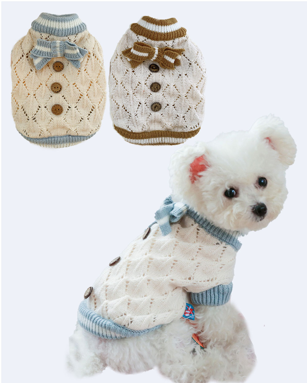 HALLE to bardzo elegancki i ciepły sweterek dla psa. Klasyczny krój i styl, w którym kolorystycznie dominuje jasny beż z niebieskimi, zielonymi lub brązowymi (w zależności od wariantu) wykończeniami u dołu swetra, jak i przy szyi. Na grzbiecie sweterek zdobią 3 brązowe guziki oraz kokardka imitująca nieco elegancką muchę.