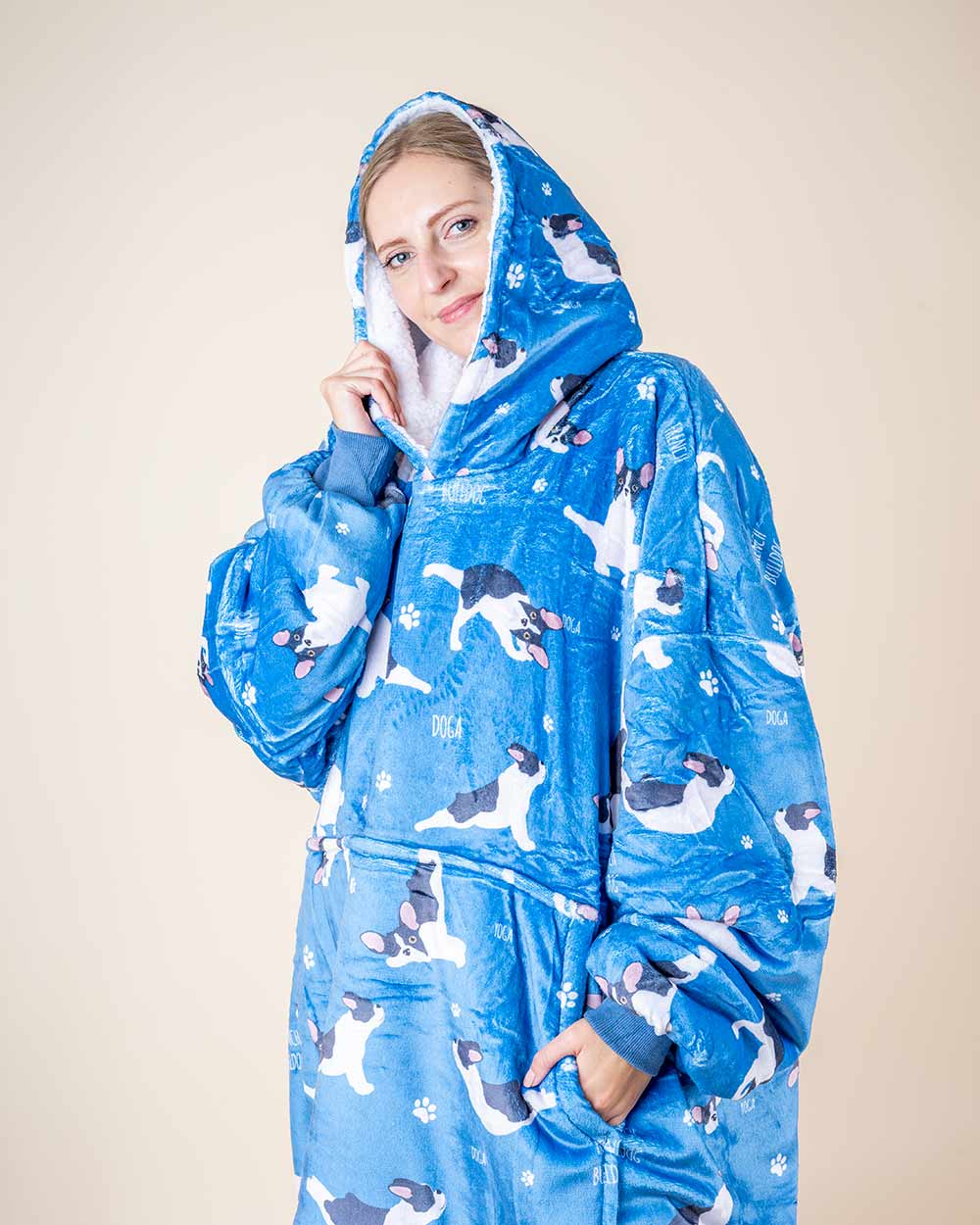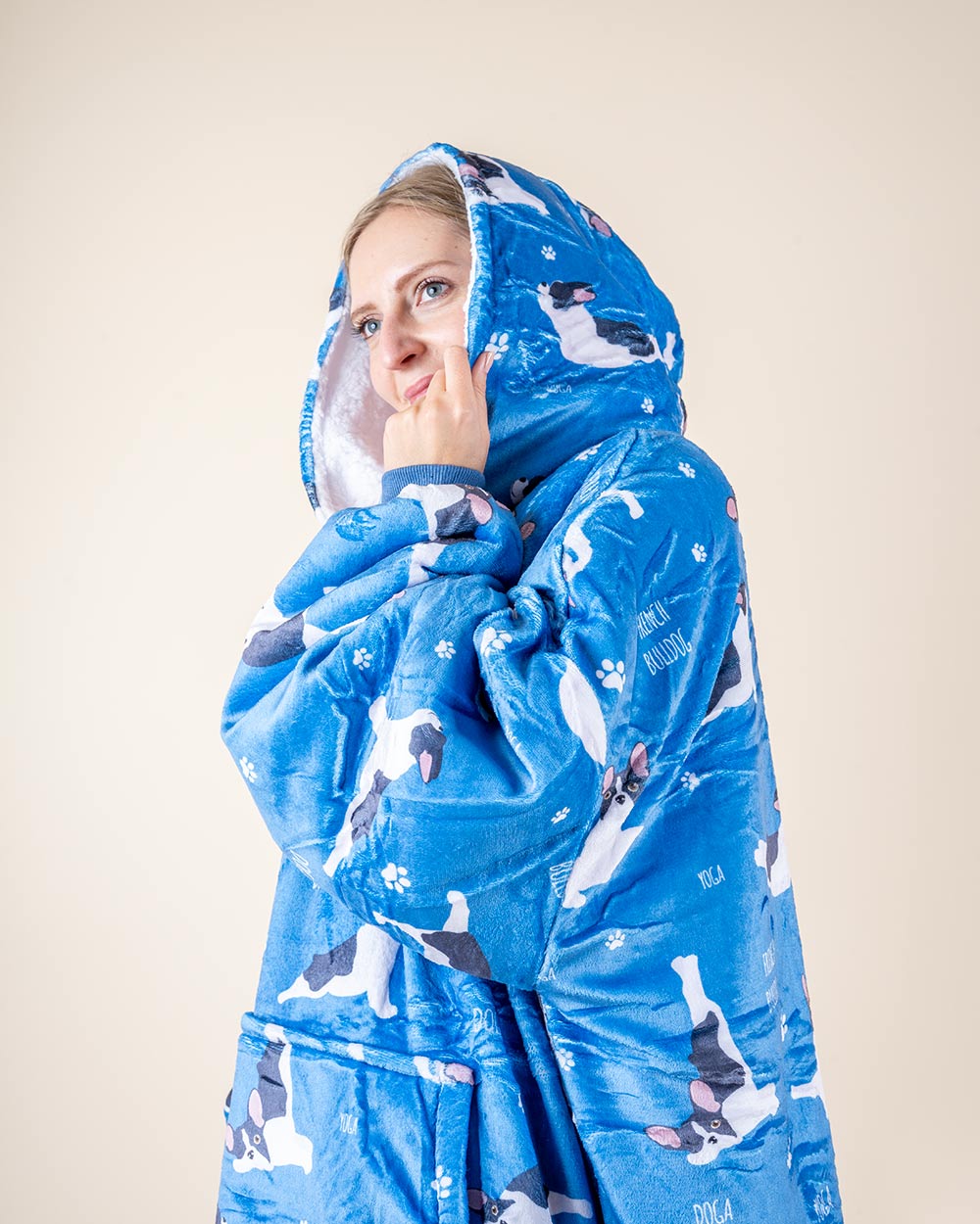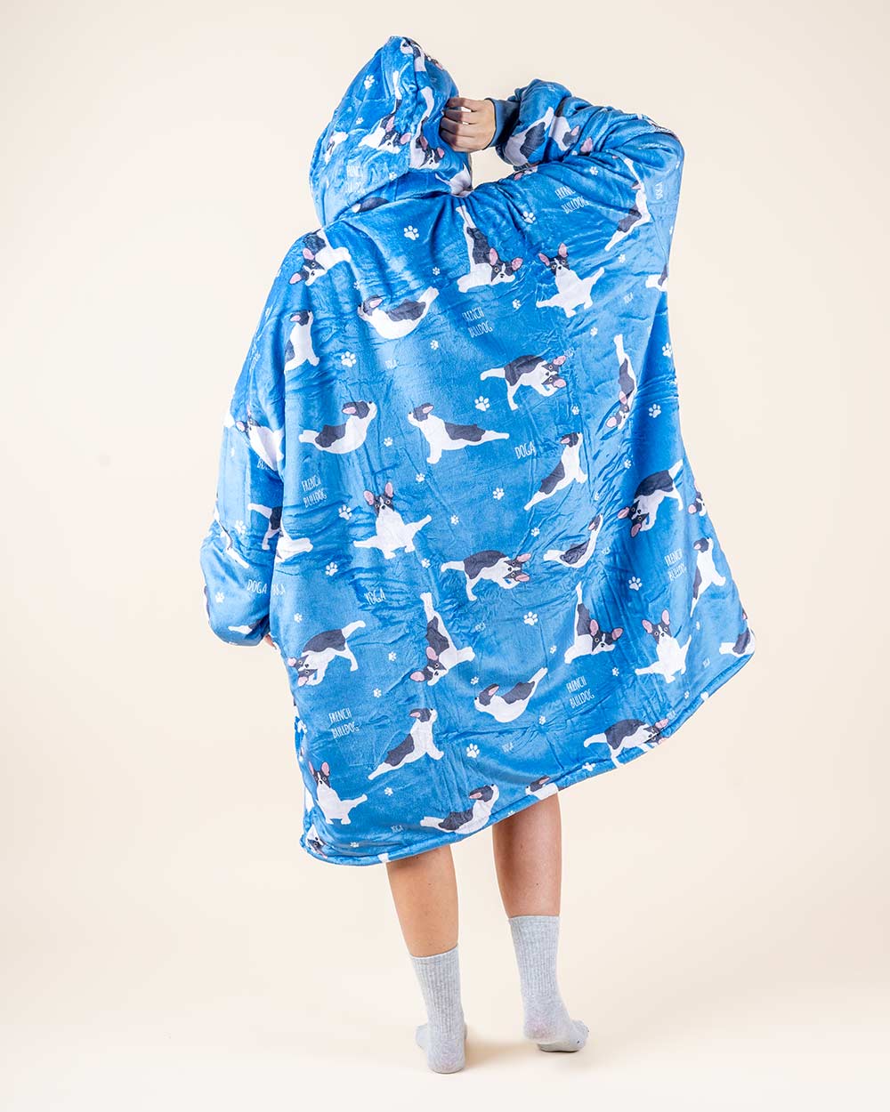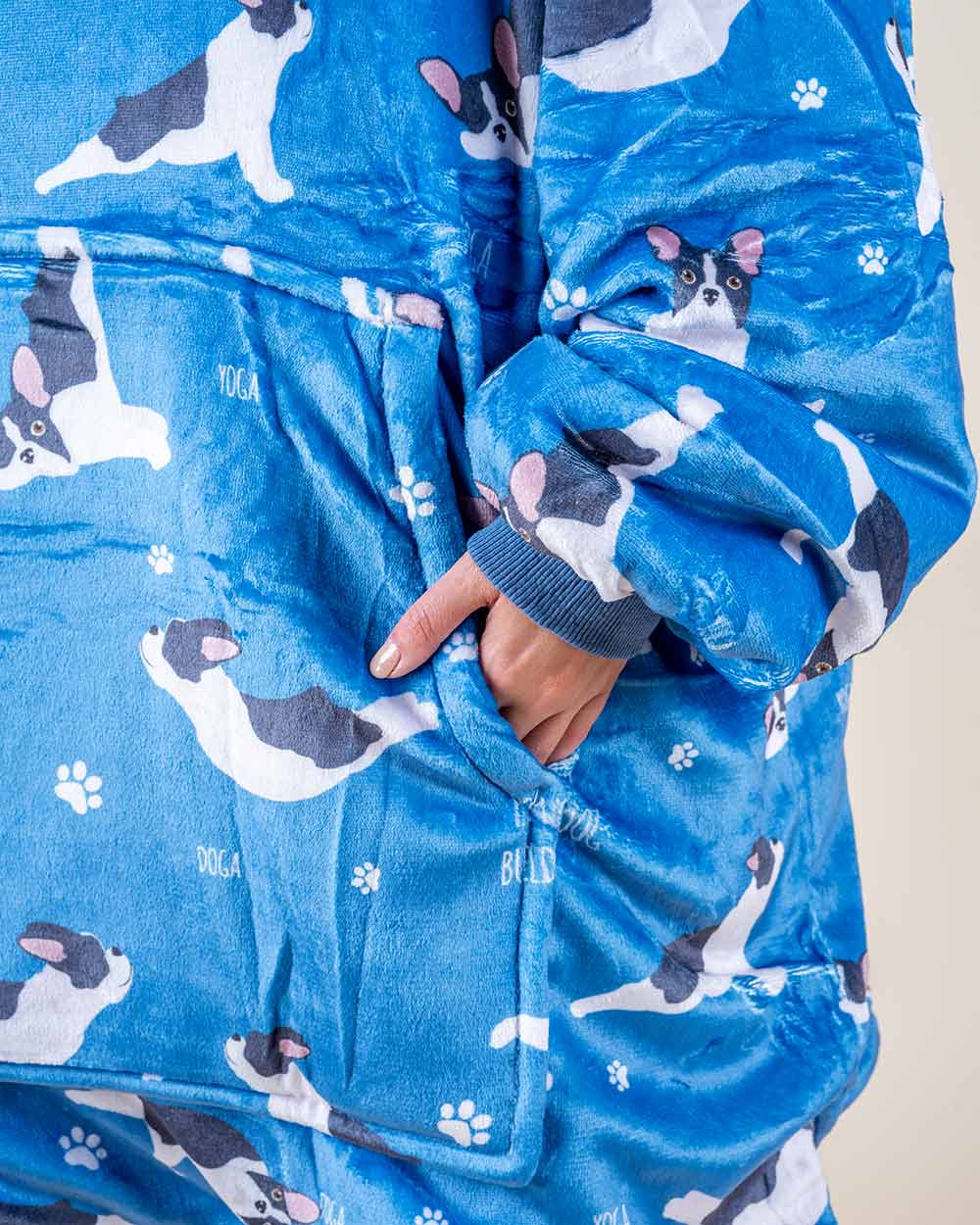 Idealny prezent dla miłośnika mopsów nie istnieje? A co powiesz na połączenie cieplutkiego koca z ogromną bluzą z kapturem, z nadrukiem buldożków w różnych pozycjach do yogi? Przed Tobą hit sezonu czyli kocobluza w buldogi YOGI.
