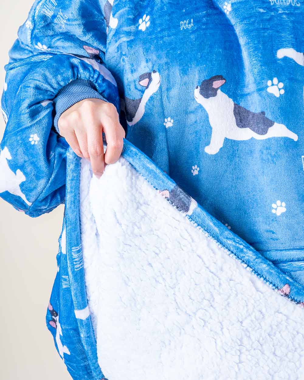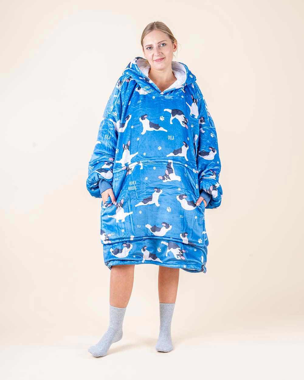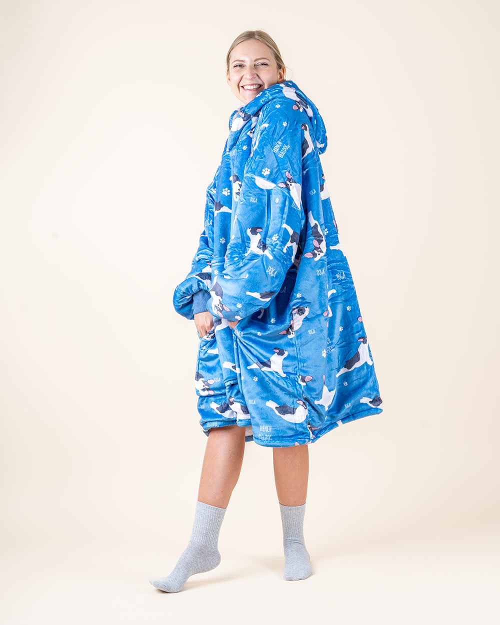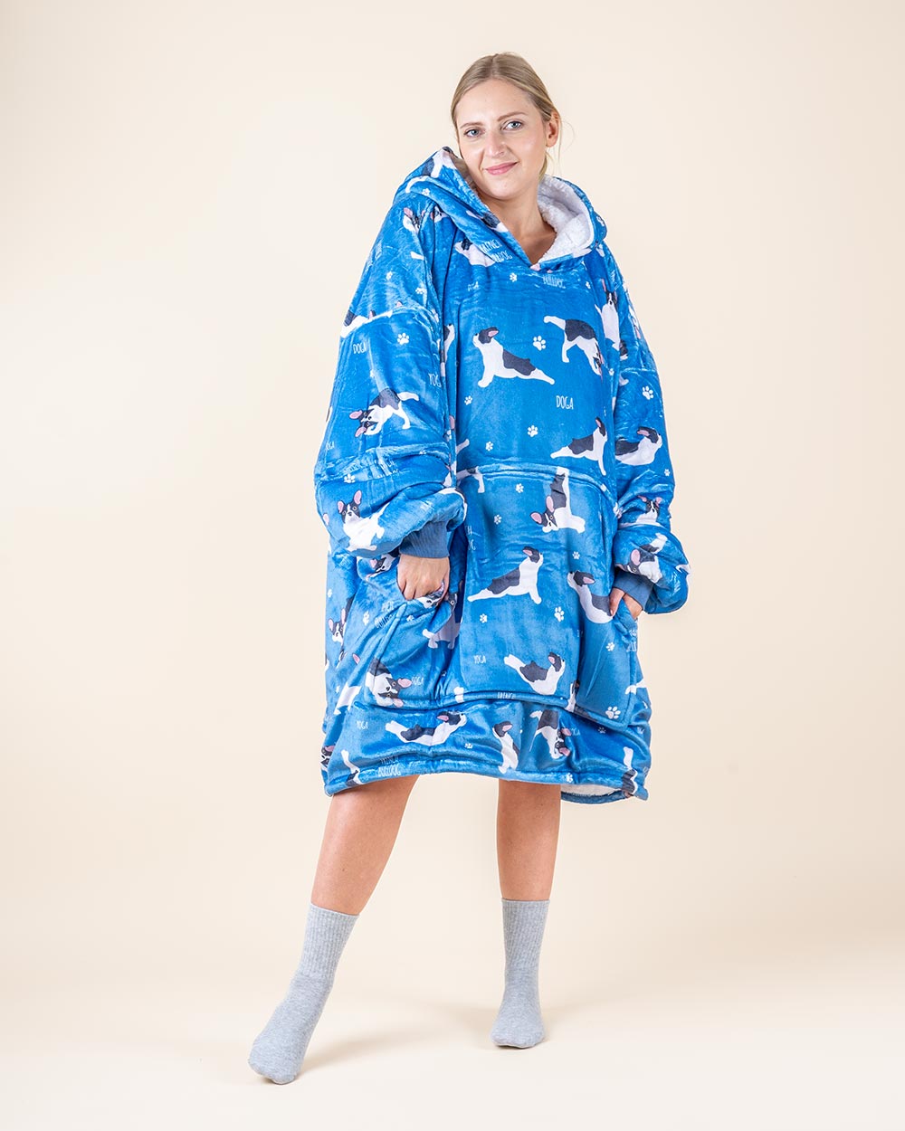 Idealny prezent dla miłośnika mopsów nie istnieje? A co powiesz na połączenie cieplutkiego koca z ogromną bluzą z kapturem, z nadrukiem buldożków w różnych pozycjach do yogi? Przed Tobą hit sezonu czyli kocobluza w buldogi YOGI.