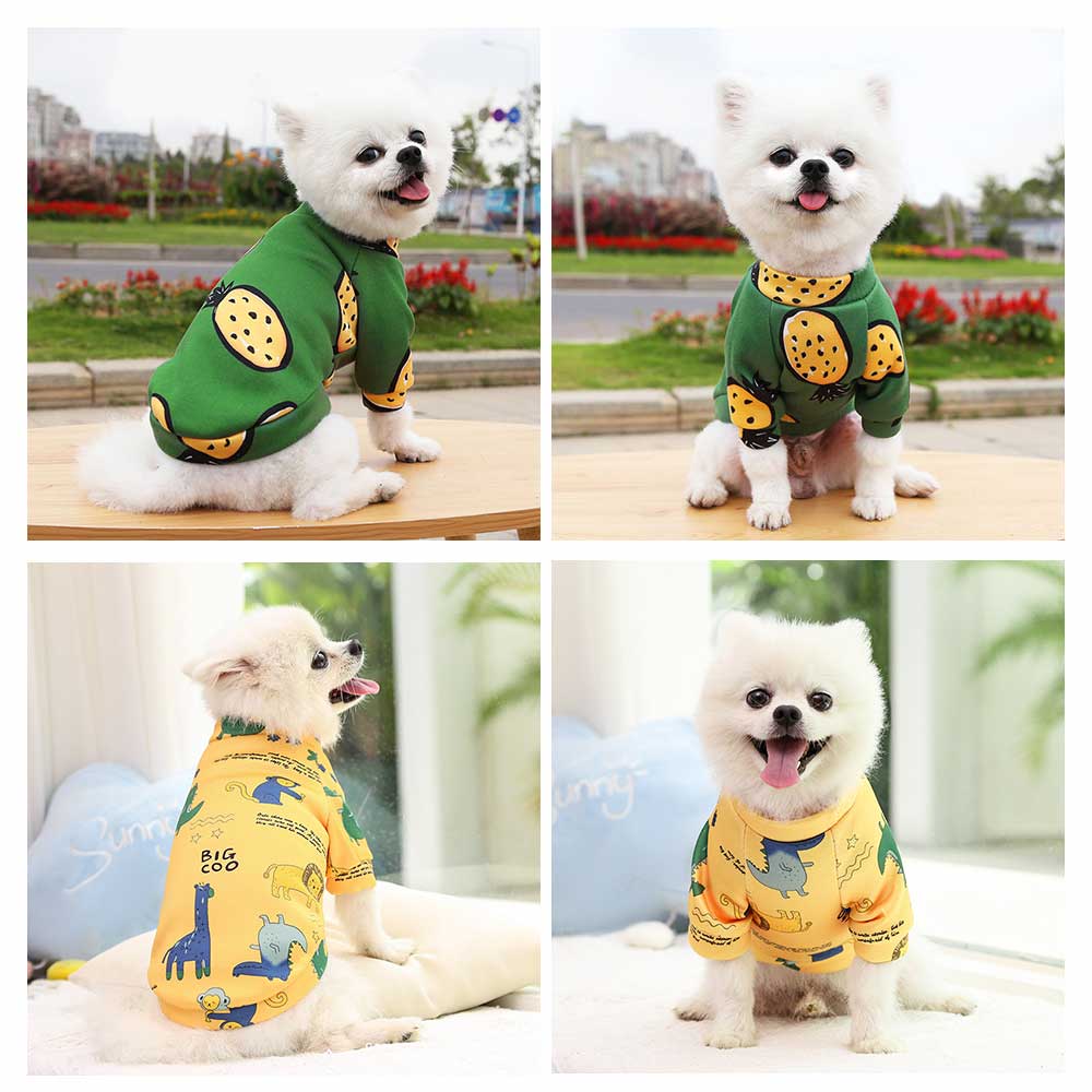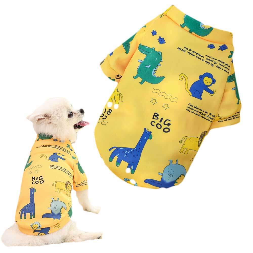 - żółta bluza dla psa ze wzorem w dinozaury,