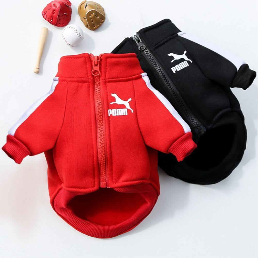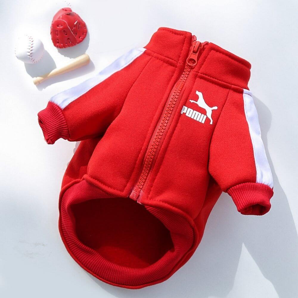 Modna dresowa bluza POMA wykonana jest z miękkiego dresowego materiału. Przy łapkach i brzuszku wszyte są się ściągacze, dzięki czemu ubranko pozostaje na miejscu. Dresowa bluza dla psa jest bardzo wygodna, zapinana przy pomocy ekspresu na brzuszku. Ten dostępny w dwóch kolorach psi dresik ma na piersi napis POMA i skaczącego psa – co z przymrużeniem oka nawiązuje do popularnej marki sportowej odzieży. Dresowa bluza dla psa POMA to świetny wybór dla każdego czworonoga, który potrzebuje dodatkowego ciepła. Dresowy, bardzo przyjemny materiał zapewnia ciepło oraz gwarantuje brak podrażnień w trakcie noszenia. Bluza świetnie się nadaje na każdy okres roku, z naciskiem na jesień i zimę. Odpowiednio dobrany rozmiar nie krępuje ruchów psa w trakcie codziennej aktywności. Bluza jest dostępna w dwóch wariantach kolorystycznych: czarnym i czerwonym.