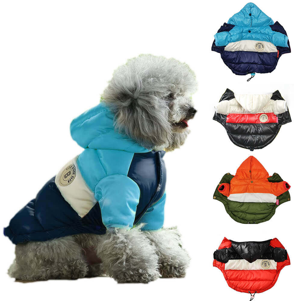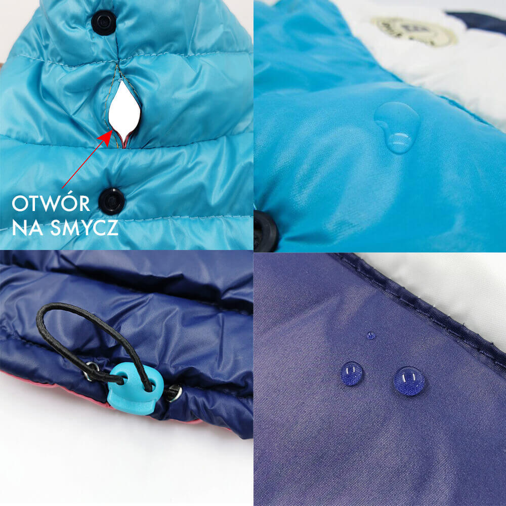 Kurtka Bingo jest wygodnie zapinana na napy. Dla wygody pupila można również przypiąć kaptur do kurtki, jeżeli w danym momencie piesek nie nosi go na głowie, żeby nie spadał podczas schylania głowy.