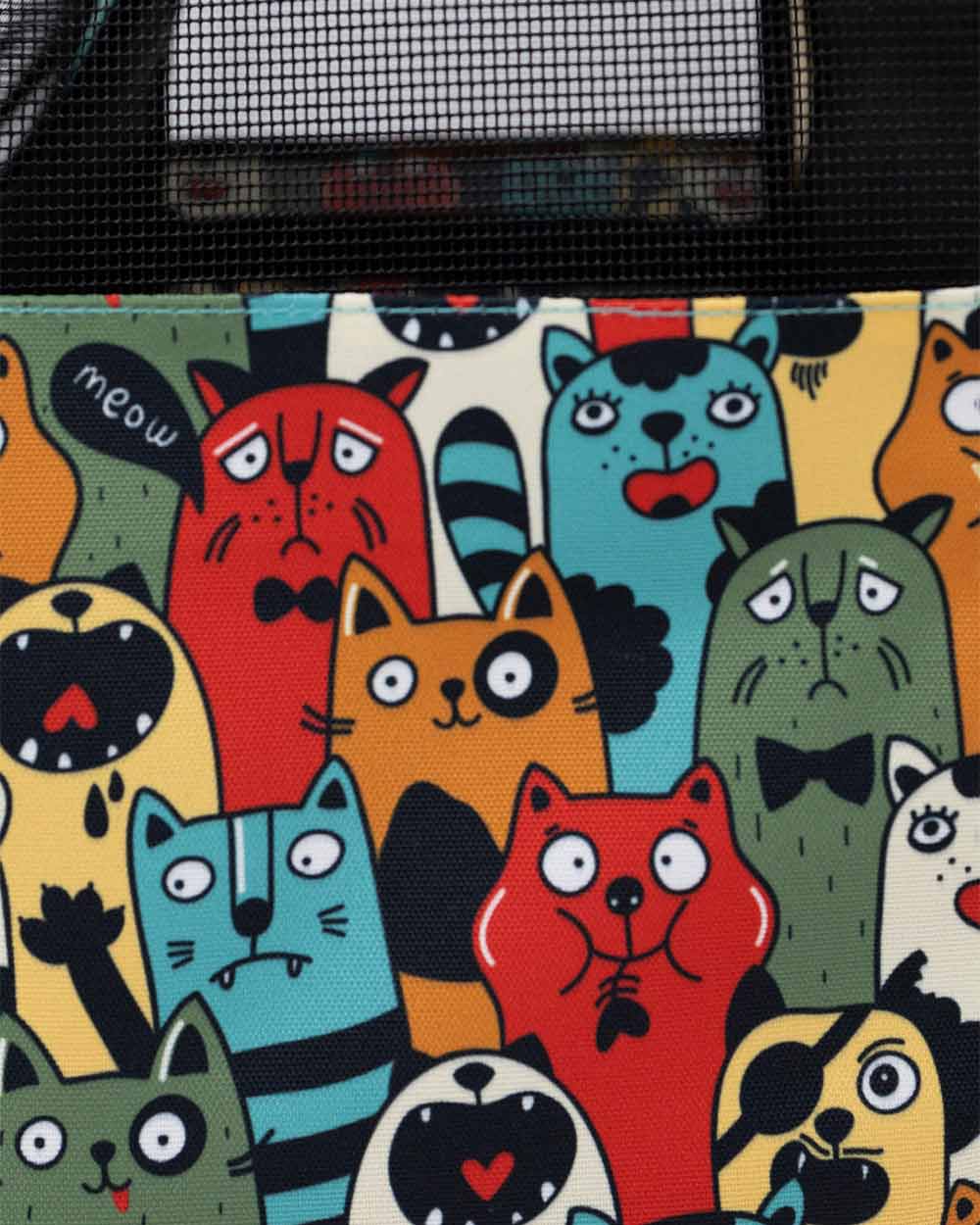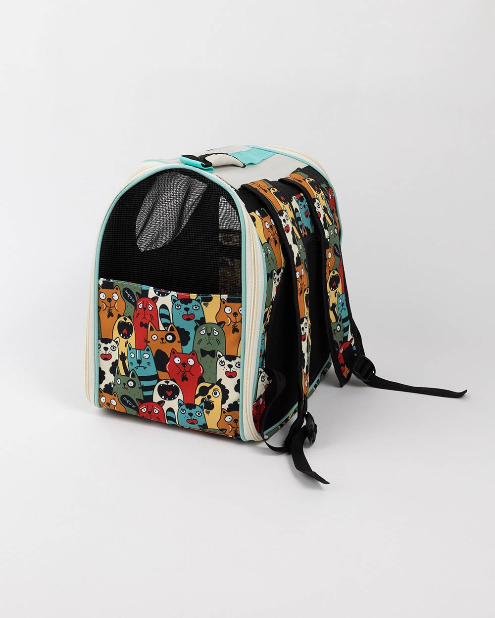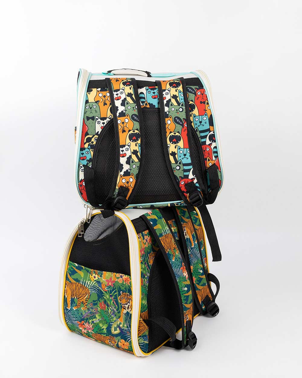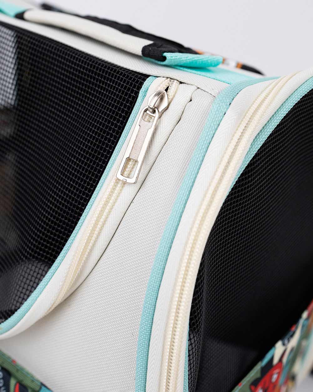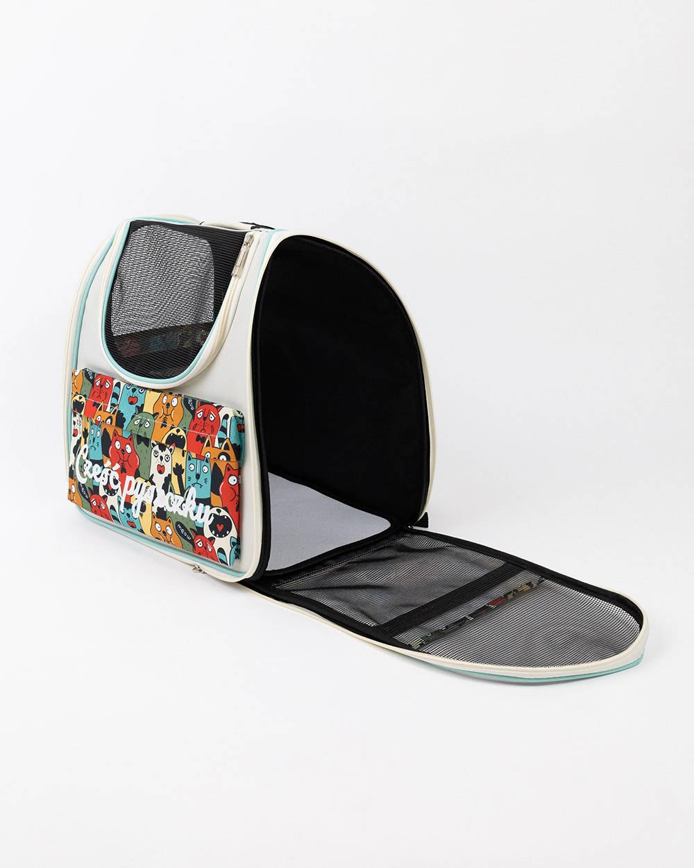 W plecaku znajdują się trzy duże otwory wentylacyjne zakryte siatką, zapewniają one zwierzakowi ciągły dopływ świeżego powietrza oraz pozwalają obserwować otoczenie, co redukuje stres psa lub kota w czasie podróży. Otwór znajdujący się z przodu plecaka można odpiąć (rozsunąć suwak) w czasie wycieczki, tak by zwierzak mógł wystawić przez niego głowę i obcerować otoczenie. Z przodu plecaka znajduje się również duża kieszeń, która pomieści najważniejsze rzeczy, takie jak książeczka zdrowia, składana miseczka, woreczki na odchody czy torebkę ze smaczkami.