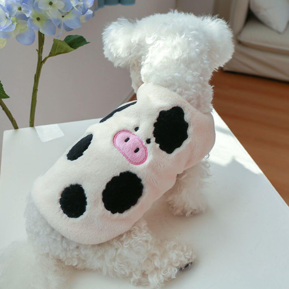 Prezentowana przez nas bluza dla psa jest biała, choć mieni się nieco na różowo pod odpowiednim kątem padania światła. Na grzbiecie znajdują się czarne urocze plamki, przypominające nieco sierść dalmatyńczyka. Plamki świetnie komponują się z zabawną minką wiejskiej krówki, dla której jedna z plamek wydaje się uzupełnieniem krowiej czupryny. Na brzuszku zaś bluza jest zapinana za pomocą solidnych nap. Jest dostępna w różnych rozmiarach, a najbardziej uroczo wyglądają w niej małe pieski. Zarówno piesek, jak i suczka będą prezentować się w niej stylowo i elegancko.