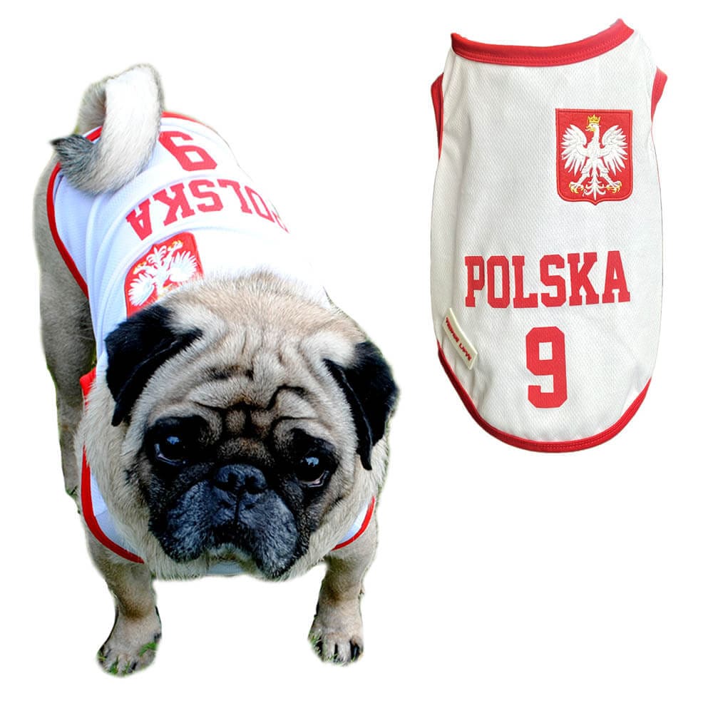 Biała koszulka dla psa posiada haftowane godło Polski i nadrukowany numer 9 . Klasyka w kroju, oryginalność we wzornictwie! Niepowtarzalna koszulka reprezentacji Polski z całą pewnością przyciągną uwagę innych kibiców. Koszulka wykonana z bardzo dobrego jakościowo materiału.